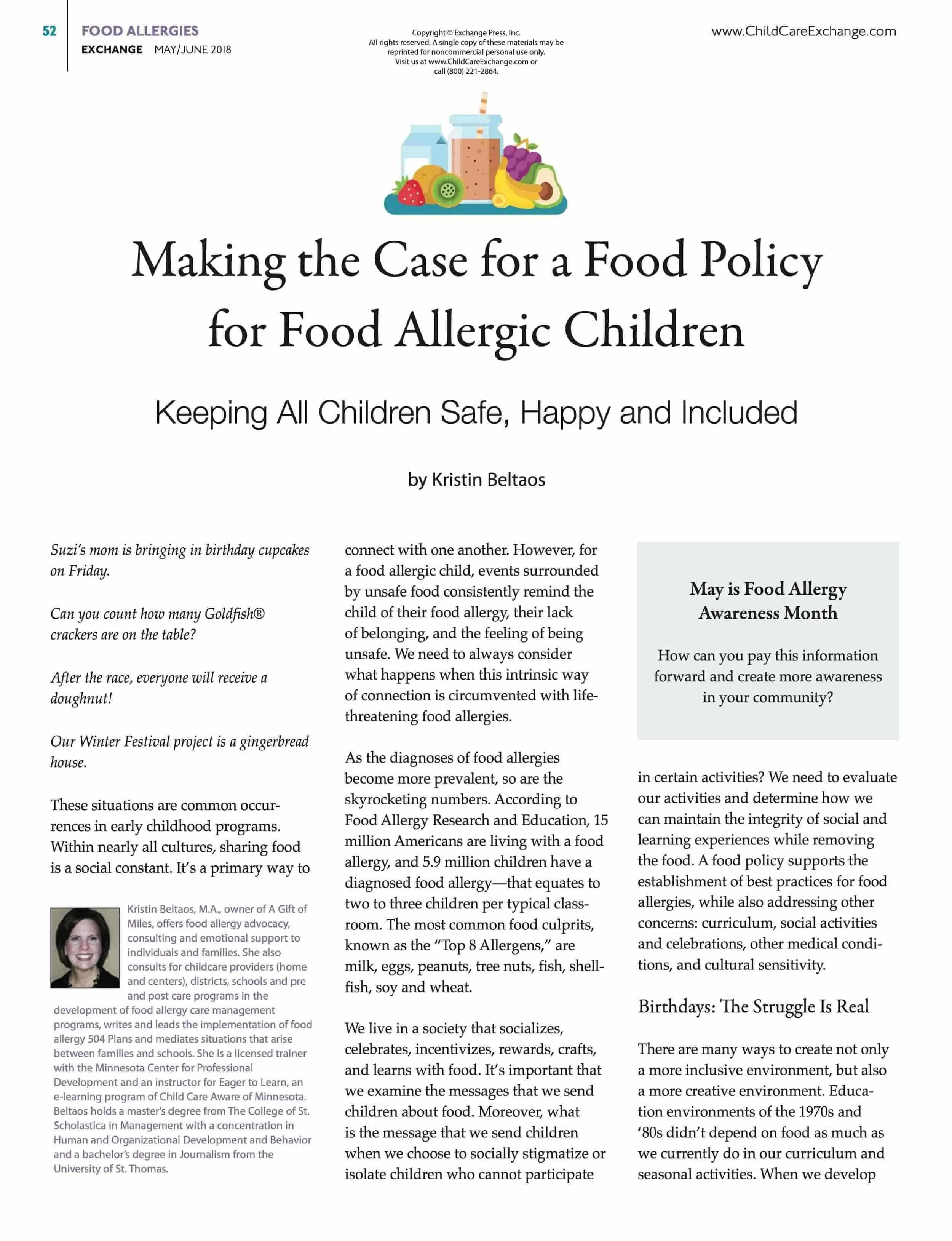 — 2018 May/June Published in the ChildCare Exchange Magazine, Making the Case for a Food Policy for Food Allergic Children